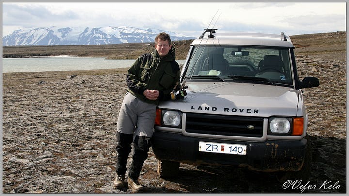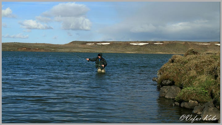 The second trip to Arnarvatnsheiði was taken with my brother-in-law, Magnús. We were quite early in the season, probably too early. We thought the trout would be moving by mid-June, but that was clearly not the case. We didn’t catch anything, and I only saw a small trout dart away from us once as we walked the bank of Réttarvatn. There was one thing I was very pleased with, though, and that was my British mountain car. The Land Rover showed what it is capable of, as the heath was still quite wet in sections.