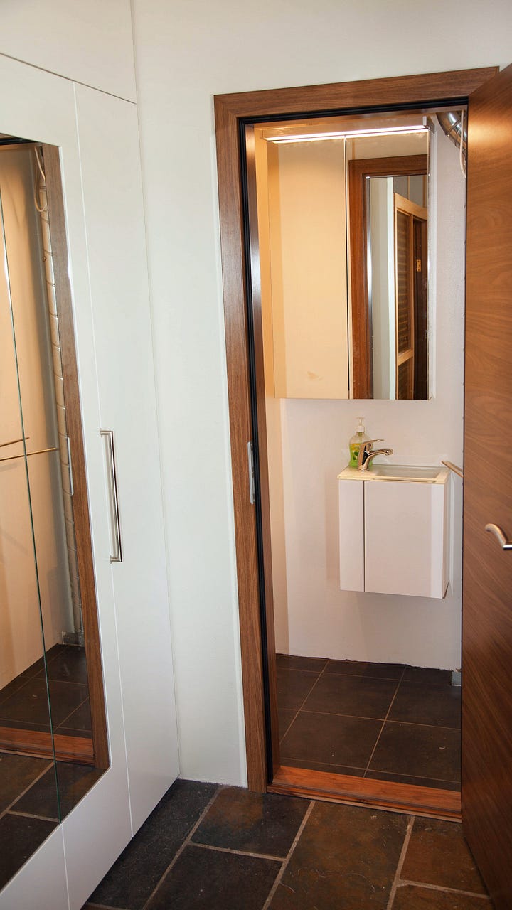 The cabinetry was handled by the woodworking shop Við og við, who have worked for us several times before. The great thing about working with them is that instead of buying ready-made units, everything is custom-made to measure. If a 43 cm cabinet fits best, then a 43 cm cabinet is what they build. Guðmundur at Við og við is also very clever at seeing what works best. For the small bathroom, however, we just took a quick trip to IKEA and Bauhaus and found something that fits well enough. The final stretch of our bathroom struggle was installing the shower faucets and the stall, the towel radiator, and the bathroom doors.