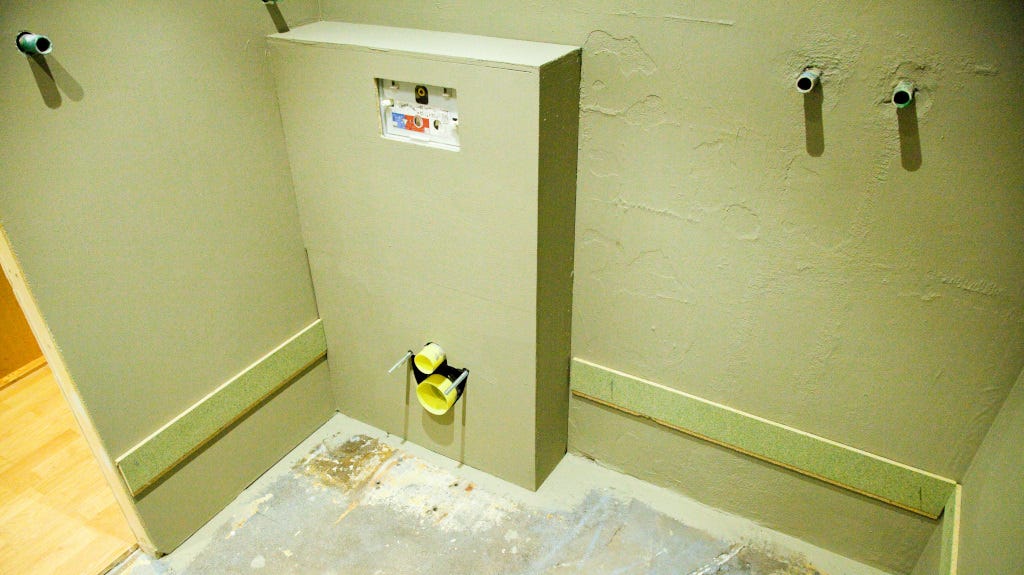 Preparing for tiling and installing the fixtures was the next task. First, I had to fill the holes in the floor slab with concrete, and then I used self-leveling compound for the final few millimeters. I thought the concrete would be tight enough, but that wasn’t the case—a bit of the leveling compound leaked through and down into the basement apartment. Understandably, the tenant was not particularly happy with me at that point.