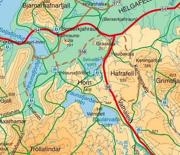 The lakes I am referring to are Baulárvallarvatn, Hraunsfjarðarvatn, Selvallavatn, and Hraunsfjörður. After the construction of the road over Vatnaleið, Baulárvallarvatn and the southwestern part of Hraunsfjarðarvatn became easily accessible for fishing. The volcano Vatnafell separates Baulárvallarvatn and Hraunsfjarðarvatn, and Horn separates Hraunsfjarðarvatn and Selvallavatn. To the southwest of Hraunsfjarðarvatn and Baulárvallarvatn are Tröllatindar, and Hafrafell lies to the east of the lakes. Geologically speaking, the lakes are relatively young. They were formed in a volcanic eruption approximately 120,000 years ago. Both Hraunsfjarðarvatn and Baulárvallarvatn are extremely deep, although their maximum depth is somewhat uncertain due to human damming projects. It is likely that Baulárvallarvatn is around 47 meters deep, and Hraunsfjarðarvatn is no less than 87 meters deep.