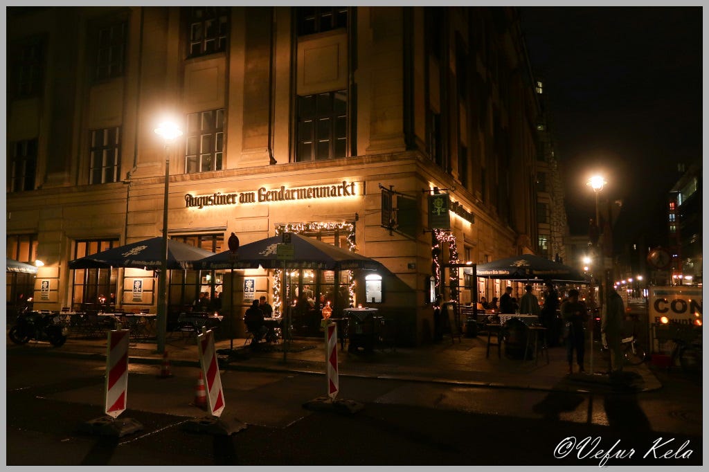 One of the things that comes with trips like this is sitting in restaurants and cafes. On our trip to Berlin, we went out to eat surprisingly little. Things just worked out that way somehow. The first evening, we were simply too late, and one restaurant after another turned us away at the door because they were completely full. Therefore, we ended up at the Doner Kebab joint by Friedrichstrasse station and had a kebab with way too much chili. The next day, we had walked so much that we simply didn’t have the energy to do anything but grab some fast food. The third evening, we went to a decent restaurant and had an expensive steak. The day after that, I got some kind of stomach bug and was not in a state to be out among people. The following day was spent recovering, so the Indian guy at the kebab joint saved us again. It wasn’t until the second-to-last evening that we sat down in a decent restaurant again. Of course, we had schnitzel.