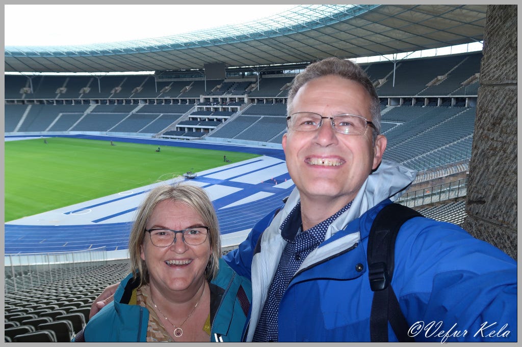 On the first day, we just strolled around the immediate vicinity of the hotel, but the following day we made a trip to the Olympic Stadium and bought a guided tour of it. Originally, there was a racetrack in this area, but the first version of sports facilities was built on the site for the Olympic Games scheduled for 1916. As it turned out, no games took place that year due to the First World War. In 1931, Berlin was awarded the right to host the eleventh Olympic Games, and the Nazis, who came to power in 1933, decided to use the games for propaganda purposes. They had the stadium that stands there today built. The stadium held no less than 110,000 spectators. The Nazis wanted to showcase their power and strength. Today, the stadium has been renovated in line with modern requirements. It now holds nearly 75,000 spectators. The stadium is the home ground of the football team Hertha Berlin. Hertha Berlin rents the stadium for their home games, which is a problem for them. There are plans to build a home stadium for the team in the near future. The stadium is also used for all kinds of larger events, such as concerts. Rammstein last played at the stadium.