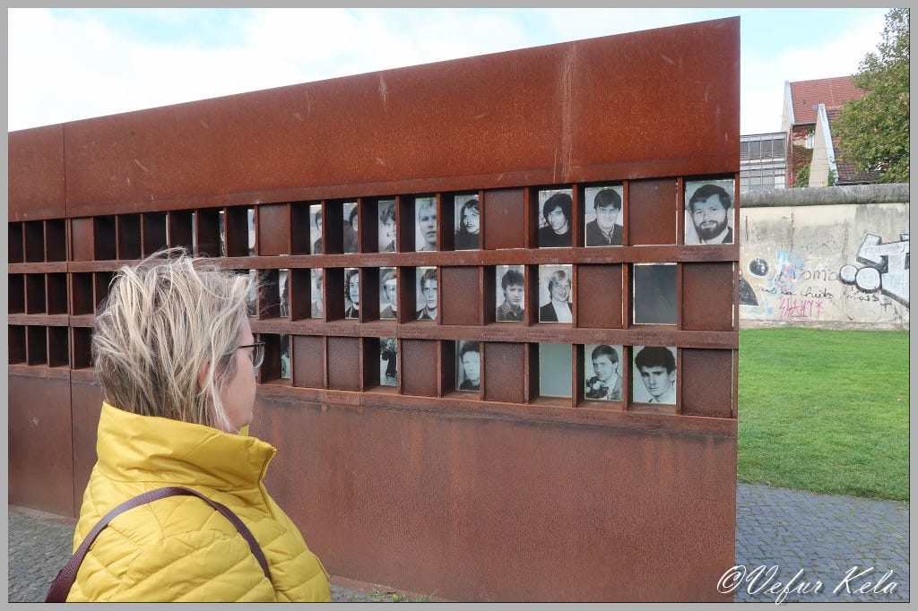 Guðrún’s and my trip east of the Iron Curtain in August 1989 came back to us as we listened to the guide’s account of the wall and its origins at Checkpoint Charlie. We felt a bit like ghosts from a distant past when we told the young people who were with us on the bike tour of our experience of life east of the Iron Curtain before the wall fell. Which it did in October of the same year we were there. This was a “My children, my children. When I was at sea...” experience. We were then to visit two other places where the origins of the wall were commemorated. In one place, a long, standing section of the wall was decorated with artwork by artists from all over the world. In the other place, there was a monument to the wall and the 141 East Germans who died trying to escape over the wall to West Berlin. The last one died on March 8, 1989, when he fell from a hot air balloon he intended to fly over the wall in. During the period 1961–1988, over a hundred thousand people tried to escape to West Germany, and over 600 of them were killed by East German border guards.