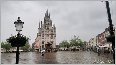 Seinni partinn fengum við fyrirlestur um hollenskt skólakerfi í kennaraháskóla í Gouda. Skólakerfi þeirra Hollendinga er ólíkt því íslenska. Þeir leggja mikla áherslu á að greina hæfni og getu nemenda með markvissum hætti og stýra þeim inn á ólíkar námsleiðir. Eftir fyrirlesturinn settist hópurinn inn á veitingastað. Úti rigndi stíft. Á endanum gafst ég upp á að bíða af mér rigninguna og rölti inn að kirkjunni Sint Janskrenk. Stærsti hluti hennar var byggður á 16. og 17. öld. Um 1350 var turninn byggður og grunnur undir kórinn árið 1485. Kirkjan er engin smásmíði. Lengd hennar einir 123 metrar, sú lengsta í Hollandi. Eftir að hafa tekið hring um kirkjuna rölti ég inn á ráðhústorgið. Þar stendur auðvitað ráðhúsið sem var byggt á fimmtándu öld. Heimferðin var síðan hálf klaufaleg því ég tók lestina til Rotterdam og þaðan til Delft. Nema að ég gleymdi að fara út og endaði í Hag. Þaðan tók ég lestina til baka. Sennilega mun mér ekki aftur takast í þessu lífi að heimsækja fjórar borgir á einum degi.