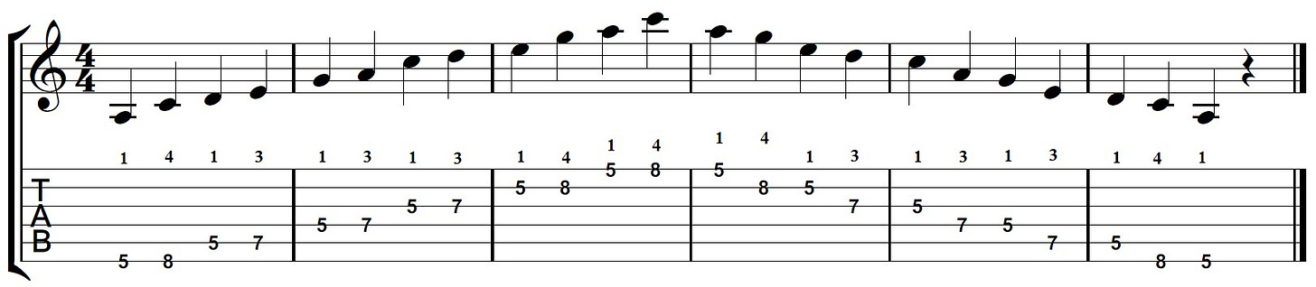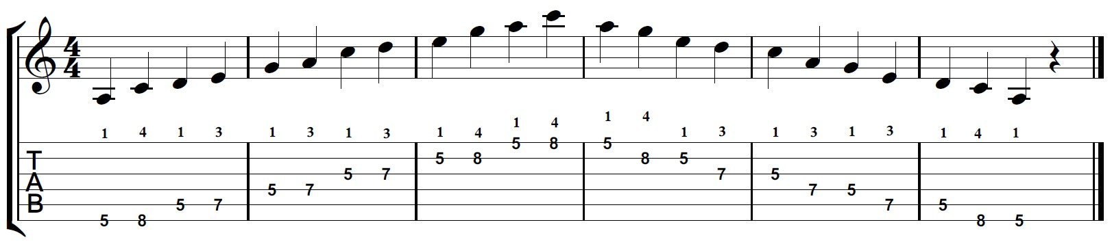 Nóturnar í a moll pentatónískum tónstiga eru A sem er rótin, C, D, E, G. Á myndinni af gítarhálsinum sérðu mynstur 1 af tónstiganum. Mynstur 1 er spilað frá fimmta bandi.