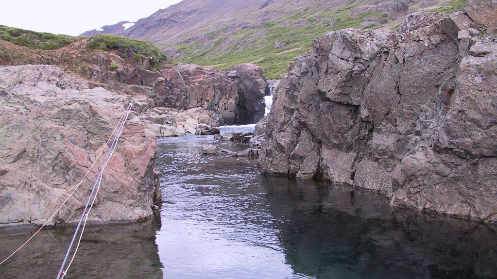 I thought the permit for Gufudalsá was expensive, but Guðrún and I decided to go for it anyway when our friends suggested a fishing trip there. We stayed for two days in a decent fishing cabin with our friends, trying our luck at catching Arctic char. I understand that the permits for this river are in high demand, so there must be stories of more fish than we actually encountered. We only found fish in one spot, ‘Rennan’ (The Chute), which is located high up the river. There, I managed to land three or four char, but they were small. We were there at the beginning of the season, so we were likely just a bit too early.