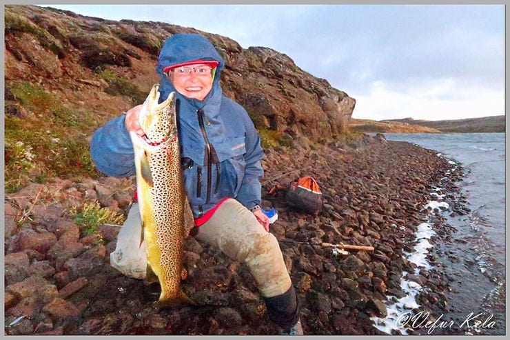 Fljótlega sé ég eiginkonuna landa punds urriða og stuttu síðar næ ég öðrum tveggja punda. Við ákváðum eftir nokkra stund að veiða okkur norður eftir bakkanum og vorum rétt lögð af stað þegar eiginkonan segist hafa misst all stóran urriða að hún taldi. Hún kastar aftur. Urriðinn er grimmur og þrífur aftur í spúninn. Að þessu sinni náðist að landa honum ogd reyndist hann vera þrjú og hálft pund. Við gengum lengra í norður og ég náði að landa tveimur um það bil tveggja punda fiskum.