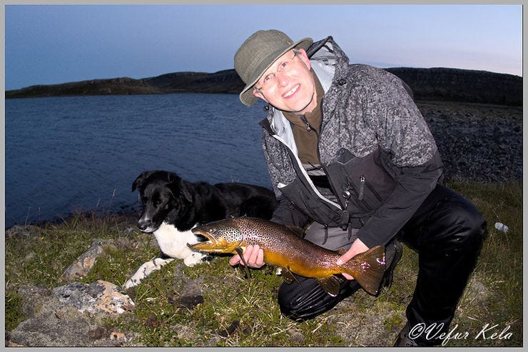 Hjónin settust niður á vatnsbakkanum á kunnuglegum stað. Þau voru ekki þarna í fyrsta sinn. Sunnanvert í vatninu synti álftapar með tvo unga og skammt frá þeim við norðurbakkann var einmana himbrimi að veiðum. Hvergi bólaði á maka og ungum. Hér hefur harmleikur átt sér stað. Eftir stutta stund í veiði hringir eigandi vatnsins nýkominn úr girðingavinnu. Hann sagði hjónunum þær fregnir að tengdasonur hans hafi fyrir stuttu farið í vatnið og landað fimm punda urriða. Ja, hérna, hugsaði karlinn. Sjálfur hafði hann aldrei sett í stærri fisk en fjögur og hálft pund í vatninu.