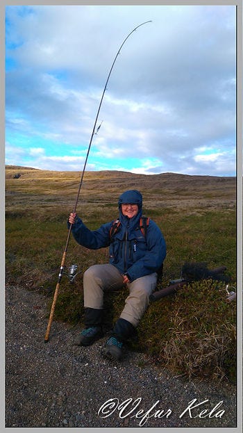 Hjónin hófu veiðar á sínum uppáhaldsstað en þar var ekkert að hafa. Þá var gengið suður með vesturbakkanum suður fyrir Réttartangann. Þar settust hjónin niður tóku upp kakóbrúsann og réðu ráðum sínum. Úr varð að karlinn veiddi vesturbakkann sunnan við tangann en konan veiddi suðurbakka Réttartangans. Hundurinn hélt sig hjá konunni og var mestmegnis til leiðinda. Hann er lélegur veiðfélagi. Þau settu í einn silung en misstu hann. Karlinn náði einum tæplega tveggja punda urriða á vesturbakkanum. Síðan var vesturbakkinn veiddur alla leið til baka og árangur enginn.