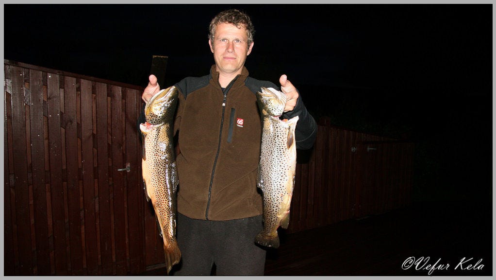 Heiðarvatnið var á sínum stað þangað var ferðinni heitið á laugardeginum. Klukkan var á milli þrjú og fjögur þegar lagt var á brattann og eftir um það bil klukkustundar göngu var ég kominn á veiðislóð. Tveir vænir urriðar náðust á land og báðir tóku þeir á bakkanum á milli Lómavíkur og Breiðuvíkur. Þegar ekki var lengur ratljóst var haldið heim með þennan ágæta feng.