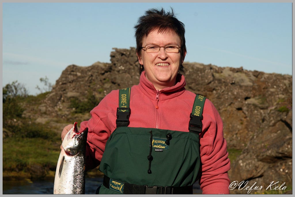 Við áttum tvo veiðidaga á efsta svæðinu í Hítará og hliðaránum Grjótá og Tálma. Veiðin var nú ekki til að hrópa húrra yfir því við urðum lítið vör við lax. Eiginkonan náði þeim eina sem við veiddum og veiðifélagar okkar fengu tvo. Allir voru laxarnir í kringum fjögur pund. Veiðiumhverfið þarna upp frá er hreint stórkostlegt þannig að þrátt fyrir lítið líf í ánum var vel þess virði að dvelja þarna í fallegu veðri þessa tvo daga.