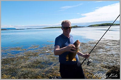 Eftir um það bil hálftíma klingdi í viðvörunarbjöllunni sem við hengdum á stöngina og inn drógum við tveggja punda þyrskling. Þann klukkutíma sem við sátum þarna í fjörunni til viðbótar var í þrígang rifið í agnið en enginn fiskur festi sig. Heim fórum við með aflann og á þriðjudeginum var þyrsklingurinn etinn og reyndist hann matur hinn besti. Eftir kvöldfréttir á þriðjudeginum röltum við niður á bryggju og út á kletta í fjörunni sem okkur þótti standa nægjanlega fram í sjó að þangið væri ekki að angra okkur við veiðarnar. Þessi endi eyjunnar kallast Tröllendi. Þarna út af grjótinu veiddum við í tæpar tvær klukkustundir. Þegar við komum til baka upp í hús um eittleitið vorum við búin að landa fjórum fiskum. Þrír þeirra voru þysklingar en sá fjórði var ufsagrey. Tveimur náðum við að sleppa aftur í sjóinn. Þysklingarnir voru um tvö pund hver.