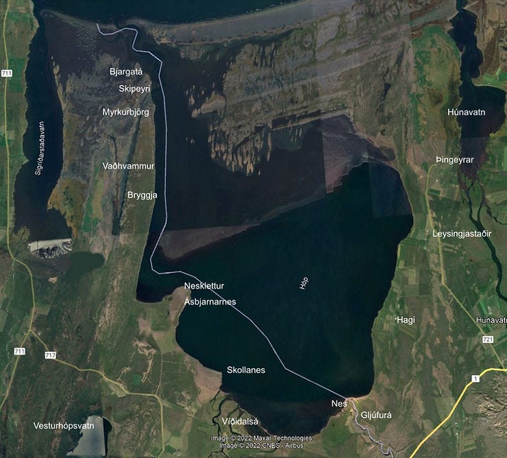 Þar sem við erum lítt kunnug veiðum í Hópinu vorum við ekkert ofurbjartsýn á árangur. Við vitum að það tekur tíma að læra á nýtt veiðivatn. Það einfaldar ekki málið þegar vatnsbolurinn er svona ógnarstór. Hópið er fimmta stærsta stöðuvatn á Íslandin, 29 til 44 ferkílómetrar eftir því hvernig stendur á sjávarföllum. Það er ekki djúpt. Einungis 9 metrar þar sem það er dýpst. Við vorum ekki með kunnugum þannig að það var ekkert annað að gera en að reyna hér og þar þangað til vænlegur staður fyndist. Á nokkrum veiðivefum fundum við einhverjar lýsingar á því hvar vænlegt væri að bera sig niður. Það þykir vænlegt að reyna á norðanverðu og austanverðu Ásbjarnarnesinu. Þar byrjuðum við og fengum sjóbleikjuna út af austanverðu nesinu. Einnig hefði verið vænlegt að aka áfram út með vatninu til norðurs og reyna við staðina undir hlíðunum vestan megin í vatninu í átt að ósnum. Reyndar er slóðinn þarna niður eftir frekar torfær. Í lýsingunum er einnig talað um nestis og salernisaðstöðu við Ásbjarnarnes. Okkur hjónunum fannst líklegt að hér væri verið að vísa í kamar sem við sáum út í miðjum móa og bæjarhús bæjarins Ásbjarnarness sem reyndist vera í algerri niðurníðslu. Við hliðbæjarhússins var torfhús sem leit ágætlega út en ekkert benti til þess að það væri umrædd nestisaðstaða því það hús var læst.