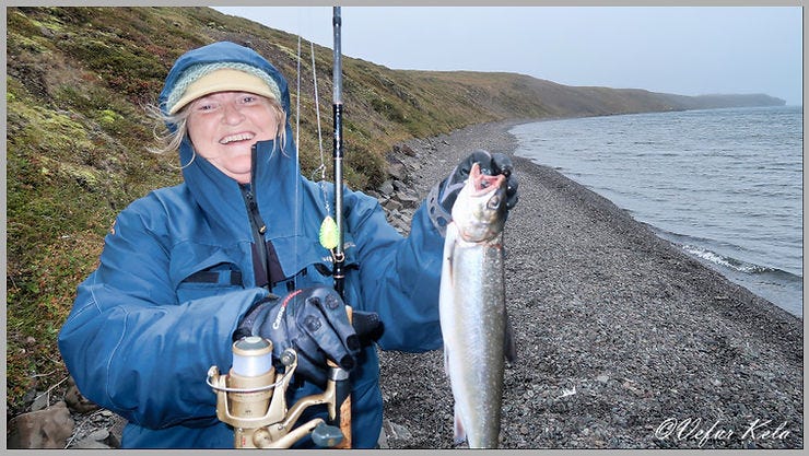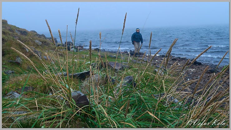 Okkur leist ekki allt of vel á þegar við beygðum til norðurs eftir vegi 716. Það var ansi þétt þoka við Vesturhópsvatn. Okkur langaði helst að sjá landslagið því við erum nú ekki oft á ferð á þessum slóðum. Þokunni létti aðeins en aldrei nóg til að við fengjum eitthvað útsýni. Það var norðanátt, dálítill vindur en ekki fannst okkur kalt þótt hitinn væri ekki nema átta til níu gráður. Við byrjuðum að reyna veiðar við klettana yst á Ásbjarnarnesinu. Þar byrjuðum við einnig árið 2014, síðast þegar við fórum í Hópið. Ekki urðum við vör þar. Fljótlega færðum við okkur norður fyrir klettana. Þar voru aðstæður betri en norðanvindurinn lamdi á okkur þannig að dvölin við bakkann þar var ekki beint notaleg. Náðum einum afskaplega smáum sjóbirting. Færðum okkur síðan suður fyrir klettana. Þar var lygnar og vistin betri. Við urðum ekkert vör við fisk svo við ákváðum að halda heim. Ákváðum að kasta spún nokkrum sinnum áður og eiginkonan setti í eina eins og hálfs punds sjóbleikju. Þar með var síðustu veiðiferð ársins lokið og við héldum heim í kvöldverð.