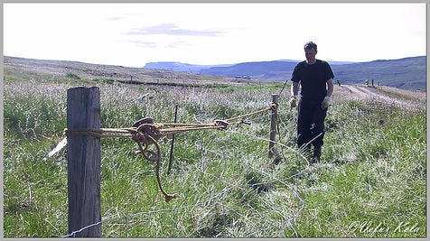 Forgangurinn þessa helgina var samt girðingin. Á hverju ári undanfarin þrjátíu ár hef ég haldið þessari girðingu við. Fyrst með tengdaföður mínum sem þá var komin nokkuð við aldur. Girðingin afmarkar landið í kringum Brautarlæk sem er 1,7 hektarar og var áður afgirt hólf sem kýrnar fengu stundum að verja sumardögum í. Ekki myndi þetta nú teljast mikil girðingavinna samanborið við það að halda við girðingu í kringum heila bújörð. Eitthvert vorið nefndi ég þetta við tengdaföður minn. Hann samsinnti því að girðingamál gátu verið vandræðamál og rifjaði upp gömul samskipti við bóndann á næsta bæ. Þeir höfðu sammælst um að lagfæra girðinguna á milli jarðanna frá Norðurá og upp að vatni. Annar gerði sér ferð í Kaupfélagið og mætti í verkið með fyrirtaks girðingaefni en hinn hefur sennilega farið í ruslahauginn því hann mætti með tunnustafi. Þannig var þetta á þeim tíma. Fólk hafði sáralítið fé milli handanna þannig að allt sem var nýtanlegt var nýtt.