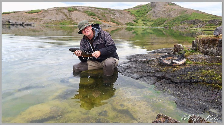 Bakkinn sunnan við Arnarfellið varð fyrir valinu. Mér til undrunar var aðeins einn veiðimaður á svæðinu og sá lá í makindum á bakkanum undir Arnarfellinu. Veðrið var stórkostlegt, skýjað og stafalogn. Það var verulega skemmtilegt að fylgjast með kuðungableikjunum í vatninu sem létu sér fátt um finnast þótt ég stæði úti í vatninu og syntu allt í kringum mig í leit að æti.