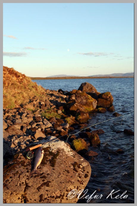 Þegar ég kem að vatninu eru að venju nokkrir að bjástra við veiðar og einn veiðimannanna hafði plantað sér niður á uppáhalds staðnum mínum. Ég ákvað því að ganga að Arnarfellinu og veiða síðan í rólegheitum meðfram bakkanum í suðurátt. Þarna háttar eilítið öðruvísi til en víðast hvar í þjóðgarðinum því þarna er malarbakki en ekki gróið hraun. Ég varð fljótlega var við að það er fiskur þarna en ekki vildi hann taka. Ekki fyrr en ég er kominn að suðurenda malarbakkans en þar tók fyrsta bleikjan. Þegar malarbakkanum sleppir tekur við falleg vík sem ég hef stundum reynt að veiða í en ekki átt erindi sem erfiði. Að þessu sinni fékk ég þó eina bleikju rétt vestan megin við víkina og missti aðra. Hér var orðið áliðið kvölds og ég farinn að hugsa mér til heimferðar en freistast til að prófa nokkur köst á uppáhalds staðnum mínum. Þar náðist þriðja bleikjan.