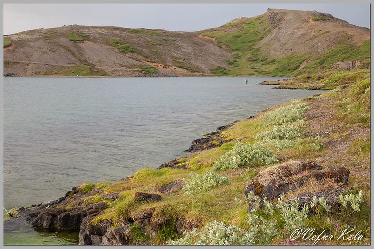 Þetta er fjórða ferðin mín í Þingvallavatn þetta sumarið. Í fyrri þremur ferðunum var ég lengst af að veiða í logni og viti menn. Þegar ég er komin norður eftir dettur í dúnalogn. Enn og aftur. Merkilegt. Aðstæður þarna á austubakkanum eru frekar einsleitar og í rauninni fátt sem segir manni hvar sé vænlegt að reyna fyrir sér. Það var því ekkert annað að gera en að reyna fyrir sér hér og þar og prófa hinar og þessar flugur. Það gerði ég en náði ekki að heilla kuðungableikjuna. Fékk hins vegar nokkrar murtur.