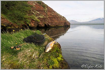 Þann 17. júní lét ég samt reyna á hvort ég gæti veitt. Fór í Þingvallavatn og ekki reyndist nú vatnið fara vel í bakið á mér. Ég óð um það æjandi og óandi og kveið hverju skrefi. Þeir sem veitt hafa í vatninu vita hvernig botninn er víðast hvar. Nú, níu dögum seinna er staðan allt önnur. Í vikunni fór ég nefnilega að finna fyrir breytingu á bakinu. Vissulega er bakið enn að stríða mér það er mikill léttir að finna að ég get notið þess að veiða. Mér tókst meir að segja að detta á hausinn í tvígang án þess að fá sáran sting. Í annað skiptið reyndar út í vatnið þannig að það var mjúk lending. Hér sannast sem sagt að verkjaveiðiferðin þann 17. júní var hin besta sjúkraþjálfun.