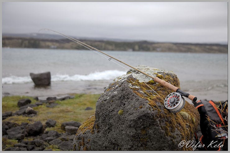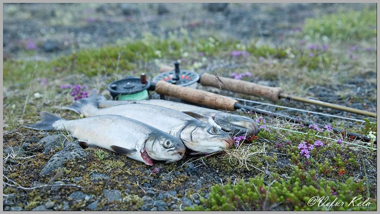 Vindinn lægði. Ég óð út í vatnið að þeim stað þar sem snardýptkar. Kasta flugunni ýmist beint út eða meðfram grjótgarðinum til sitthvorrar handar. Himbrimapar var að sniglast í kringum mig með ungana sína tvo. Fuglarnir voru greinilega vanir veiðimönnum því þeir voru gjörsamlega skeytingalausir um athafnir mínar. Ég kasta flugunni beint út og bíð um stund á meðan hún sekkur. Skyndilega kemur annar fullorðni fuglinn upp úr vatninu einungis þrjá metra til hliðar við mig. Hann hann horfir í kringum sig. Stingur sér síðan á kaf og rennir sér á fleygiferð fram hjá mér meðfram grjótgarðinum. Á fleygiferð segi ég því það er með ólíkindum hversu hratt fuglinn geystist hjá.