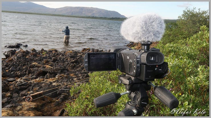 Til að komast að veiðistaðnum þarf að klöngrast dálítið og troðast í gegnum kjarr. Eiginkonan kunni mér litlar þakkir fyrir að draga hana þarna niður eftir. Sagðist vera bæði lofthrædd og of stirð fyrir svona klöngur. Það var nánast logn þegar við lögðum af stað og hitinn 16 gráður. Það tók okkur svona fimmtán mínútur að komast á veiðistað en þá var vestanvindurinn ofan af heiði líka mættur þannig að það var ekkert auðvelt að koma færinu út.