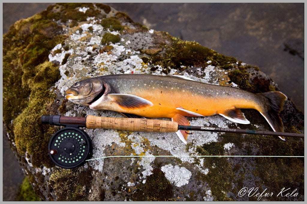When I arrive at the planned fishing spot, I remembered reading that one should wade out from the point (tá) there and cast towards the area where Bjarni Benediktsson’s cottage stood before it burned down. I did this, and on the third cast, I hooked a beautiful char. I thought at first it was a trout because it was quite powerful, but it was a char. I forgot the landing net at home, so I tried to drag the char to land, but the beauty escaped in the end.