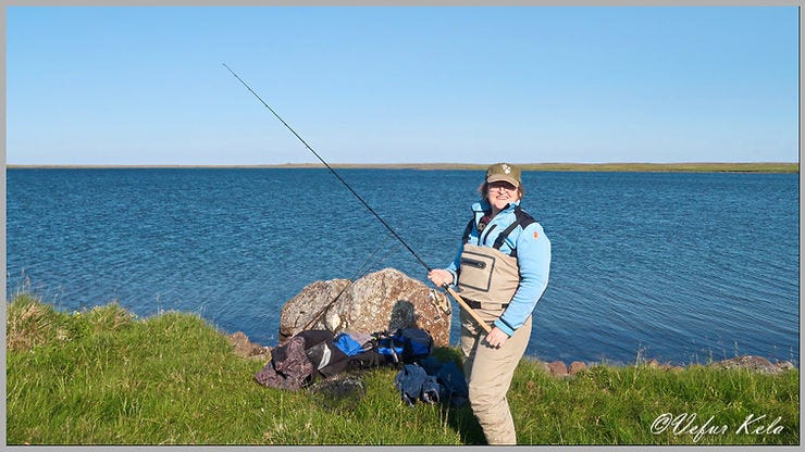 Melrakkaslétta is home to numerous lakes, many of which are undoubtedly fine fishing spots. Just north of Raufarhöfn, there are three lakes where the Fishing Card (Veiðikortið) grants access. Naturally, we took the opportunity to try our luck at one of them on Saturday evening. We chose Hraunhafnarvatn, the largest of the three; the others are Æðarvatn and Arnarvatn. In the sweltering heat, we walked along the lake toward the mouth where the Hraunhafnará river flows into it. It was a sweaty trek. When we thought we were almost there, we settled down and began fishing. I walked around a bend in the bank, thinking the river mouth was just on the other side. It turned out I had to walk a bit further to reach it. There, I cast a fly called Alma Rún, and after only a few casts, I landed a one-pound brown trout. I understand the trout in this lake can grow quite large, up to six pounds, and the Arctic char ranges from half a pound up to three pounds.