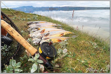 Just as I was packing up my gear, another angler appeared on the bank as if on cue. I asked him to take a photo of me with the final char for my fishing blog. He was happy to oblige, and I’m very grateful to him—not only for the photo but also for the story of the Great Northern Diver (himbrimi) that wouldn’t leave him alone after he’d fed it a Murta. After receiving the fish, the bird loomed over the angler in hopes of more, eventually forcing him to stop fishing altogether.