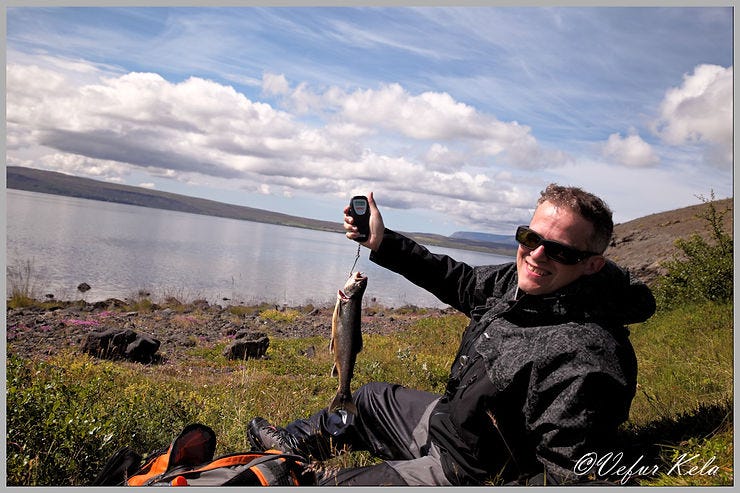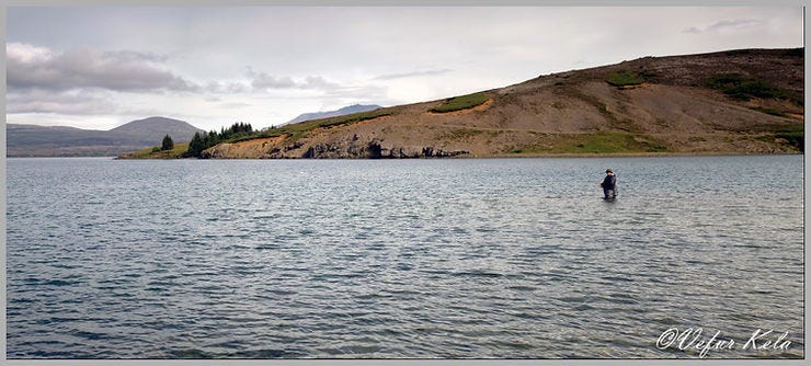 According to the forecast, fishing conditions were expected to be favorable on Tuesday, July 12th—a very mild southeasterly breeze. So, my wife and I got up as early as is considered “Christian” (civilized) and were ready on the shore south of Arnarfell by around 8:30 AM. However, nothing happened all morning, except for the sun beating down on us mercilessly while the Arctic Terns and Loons showed off their fishing skills. Around eleven o’clock, a fisherman arrived and marched straight along the shore toward Mjóanes. He then waded into the water and didn’t budge for the next three hours. To me, his entire demeanor suggested that this was a man who knew exactly what he was doing.