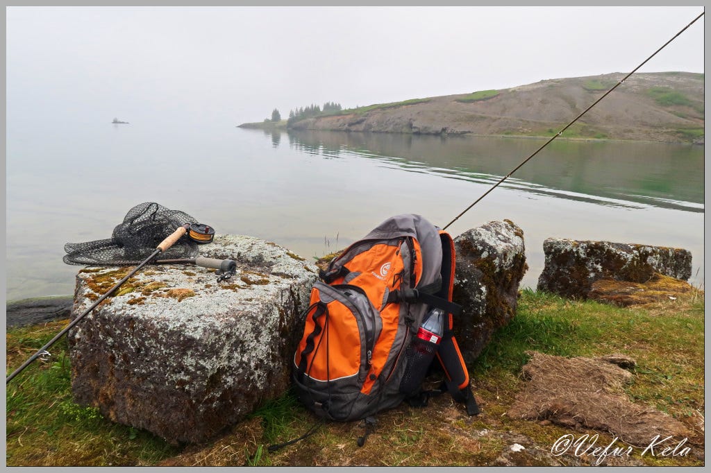 I began fishing around seven o’clock by the rock on the eastern bank, out from the crack below Arnarfell. There is often fish there, and it’s a comfortable spot for casting. I didn’t get a bite, but there was definitely fish around, as I twice saw and heard splashes on the surface. At one point, a beautiful snail-type Arctic char (kuðungableikja) swam right past me. After fishing there for two and a half hours, I moved to the next promising spot.