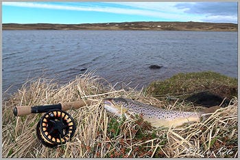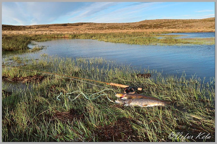 Now, thirty years later, I am much better equipped for the road, and my new mountain vehicle delivered me back and forth without a hitch. Laxárvatn is not a large lake—only half a square kilometer. It holds brown trout ranging from one to three pounds. I had been casting my fly for about an hour when a one-and-a-half-pound trout took an orange Nobbler. This was just west of the middle of the southern bank. For a long while after that, nothing happened, even though I tried changing flies and testing a mid-sink line as well. I then walked over to the eastern bank, switched back to a floating line, and tied on an exceptionally beautiful nymph imitation—the name of which I have no idea. On this lovely nymph, I landed a trout weighing just over two pounds.