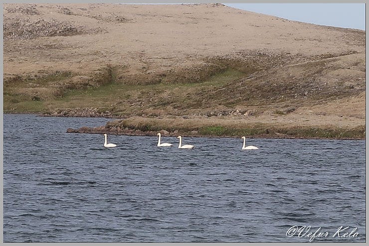 The trio drove up to Holtavörðuheiði in the eldest daughter’s SUV and then hiked eastward until they reached Tangavatn. They fished for seven hours without a single strike. That didn’t matter, however, as the man, the woman, and the dog thoroughly enjoyed being out on the moor in the company of the birds. Four swans glided across the lake, keeping their distance. The Great Northern Diver (himbrimi) was also in its usual place, its calls echoing across the water. It is far more cautious here than its counterparts at Lake Þingvallavatn, being less accustomed to human presence.