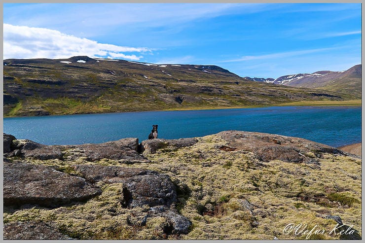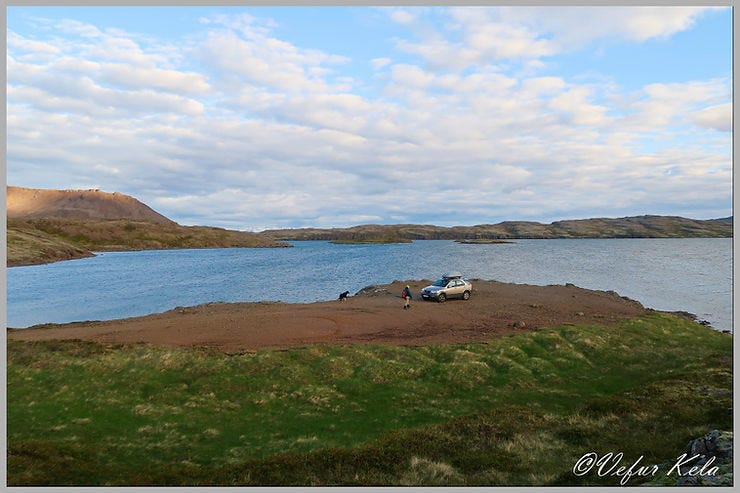 Eftir þrjátíu kílómetra akstur niður Norðurárdalinn og fimmtán kílómetra akstur upp að vatninu lögðum við bílnum á tanganum þar sem Guðrún setti í bleikju í minnisstæðri ferð í vatnið fyrir rúmlega 22 árum. Þarna hlóðum við á okkur nauðsynlegum búnaði og maður, kona, unglingur og hundur gengu af stað. Þar sem við þekktum okkar takmörk fórum við einungis fetið og gangan inn eftir tók okkur heila klukkustund. Gangan eftir austurbakkanum er einstaklega þægileg því hvergi er um brattan veg að fara og slóði liggur alla leið inn í botn. Síðast nefndu ferðafélaganna þekkti engan vegin sín takmörk og rauk út og suður þrátt fyrir ráðleggingar ferðafélaganna um annað. Hann átti eftir að taka afleiðingum af því.