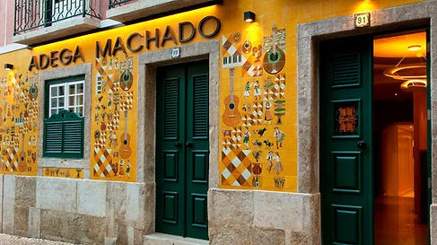 English Matters buðu til kvöldverðar á Adega Machado veitingastaðnum í Bairro Alto hverfinu á þriðjudagskvöldinu. Veitingastaðurinn hóf rekstur árið 1937 þannig að ekki er hann nýr af nálinni. Matseðillinn er sagður vera þjóðlegur. Ekki get ég nú sagt að við munum svo glöggt eftir matnum en þjónustan var góð og það var sérlega skemmtilegt að heyra Fado tónlistina á milli rétta. Þar sem maturinn var í boði English Matters höfum við ekki hugmynd um hvort hann var dýr eða ekki. Sennilega mun dýrari en hefðbundinn kvöldverður en það er eðlilegt því það var lifandi tónlist í boði. Fado tónlistina mætti ef til vill kalla portúgalskan blús. Þá er maður að vísa í textana sem einkennast af uppgjöf, döprum örlögum og þrá. Tónlistin sjálf er ekkert lík blús. Hún er flutt af söngvara, klassískum gítar og portúgölskum gítar ásamt órafmagnaðum bassa, oft kontrabassa. Erindin skiptast gjarnan á að vera í dúr eða moll og takturinn oft tví- eða þrískiptur eins og í vals. Rubato er gjarnan notað til að gefa tónlistinni tilfinningu. Bassinn heldur taktinum réttum en söngvarinn leikur sér að því að teygja taktinn í lok hendinga til að auka á dramtíkina.