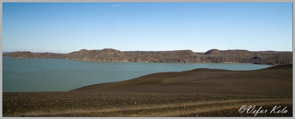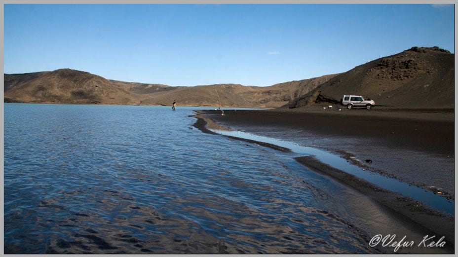 In the past, the lake was supposedly known for large trout, and in the accounts I found about the lake, the common size of the fish is 1.5 to 3.5 pounds, which is a decent size. It reportedly does not get much larger than that because then it would need access to larger food sources, like three-spined sticklebacks and such. The fish that is in the lake is said to be excellent food fish, deep red in the flesh. Until the middle of the last century, people believed the lake to be fishless, but decent spots were found in the innermost part of Austurbotn, which is south of a massive headland, Útgönguhöfði, that divides the northern part of the lake in two. According to our sources, it is most promising to try fishing from a spit that extends far out into Austurbotn, about 7-800 m before reaching the bottom of the bay. We were also pointed towards trying near cliffs that are approximately in the middle of Austurbotn, where it is slightly deeper. The third place we were pointed to is under cliffs on the northern bank of Austurbotn.