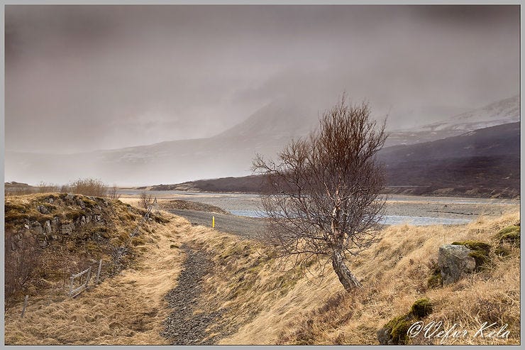 Sheltered from the north wind behind the farmhouse at Krókur stood a few handsome spruce trees, and by the roadside, just across the bridge over Norðurá, stood a solitary birch shrub. The trees behind the house hadn’t always been there; they were rescued when the road south of the river was constructed. My parents-in-law had originally planted them on a rocky outcrop overlooking the river, just below the farm. When the road was built, the Road Administration insisted on excavating fill material from right beneath the trees. Some were saved and moved behind the farmhouse, while others found a new home at the Hraunsnef farm further down the valley. The birch shrub by the roadside is the only one that survived the construction in its original spot.