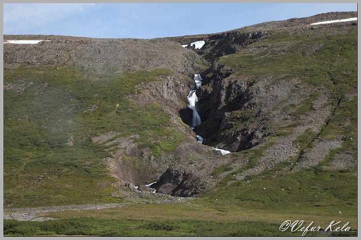 Consequently, no fish were caught except for a two-pound sea-run Arctic char that struck a black Toby lure in Hermannshylur. This char will go down in the history books, as it is the first char we have ever caught in this river. Calling Hermannshylur a ‘pool’ (hylur) is a misnomer, as I see no pool there—only a heavy, flowing stretch. The river from Þjóðbrókargil flows into Selá just above Hermannshylur. The water in the Þjóðbrók river was slightly clearer than in Selá, and it was at the confluence where the char took.