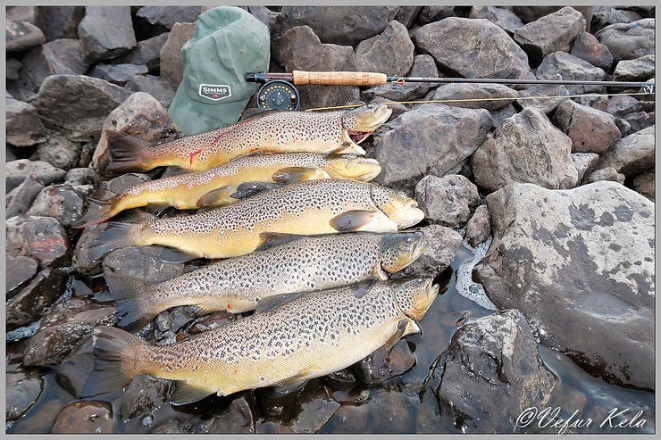 After dinner, I strolled over to Breiðavík and cast across the bay from the west. I got no reaction and was starting to think about heading home. That’s when a 2.8-pound trout took my lure. Naturally, I kept at it, but no other fish bit. I thought to myself that there must be fish at the spot I had visited earlier. I walked back with my fly rod, and soon a 2-pound trout took a black Nobbler. I cast again, and again there was a strike on the Nobbler. This was a big fish that fought hard. To my frustration, the line snapped—and I realized I had left my fly box back at Breiðavík! I went to fetch more flies and my spinning rod and ended up landing three more trout. Two took a red Nobbler, but then the fly disappeared into the depths when a trout snapped the line. I switched back to the lure and landed one more. All of them were around three pounds. The total catch for the trip was five trout, ranging from two to three pounds.