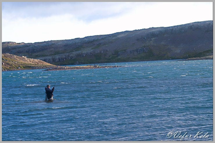 We walked east of Grunnuvík, intending to fish from the eastern bank heading north. On that side, the wind wasn’t directly in our faces, allowing for decent casting distance. I was hoping to use my fly rod, and we started at a spot that had yielded well last year. However, fly casting proved difficult. The wind was so strong that the slack line blew about, frequently tangling. When it wasn’t getting caught on the net—which kept swinging in front of me—knots formed in the fly line, ruining the casts. It was so frustrating that I eventually gave up and followed my wife’s lead: I switched to a lure, which worked as long as it was heavy enough.