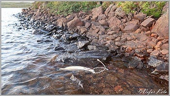 I didn’t start in Veiðivík, though. Instead, I walked straight to the cliff south of Grunnavík. I began casting there but didn’t see a sign of life. I fished my way into the bay north of the cliff; there was one single strike on the lure, but only that once. I continued south toward the spawning grounds, where I waded quite far out into the lake toward the Great Northern Diver islet (Himbrimahólminn). I cast repeatedly as I made my way north and soon caught one small trout. I tied it with a string to the loop on my waders because I didn’t feel like wading all the way back to shore. Soon after, I realized the trout was gone. The knot had come undone.