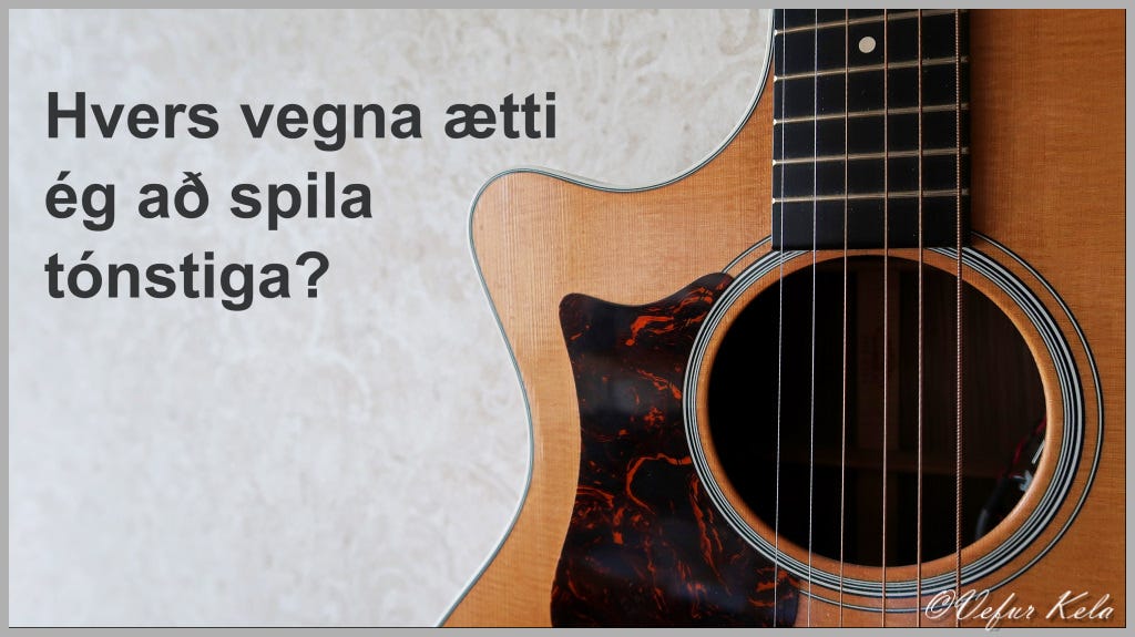 Rétt eins og svo margir, ef ekki allir, sem eru að bögglast við að læra á gítar hef ég spurt mig. Verð ég að eyða tíma í að spila tónstiga? Svarið við spurningunni er nei ef markmiðið er aðeins að spila undir söng með vinnukonugripunum. Ef markmiðið er háleitara þá er svarið allan daginn já. Ef þú ætlar þér að verða lipur gítarleikari þá eru tónstigar ekki eitthvað sem þú sleppir að æfa. Markmiðið með því að æfa tónstiga er ekki að geta spilað þá fyrir aðra. Það hefur nefnilega ekki nokkur maður ánægju af því að hlusta á þig spila tónstiga. Bíðum nú við! Ef enginn hefur ánægju af því að hlusta á tónstiga. Hver er þá ávinningurinn? Hann er margvíslegur. Ef við flokkum hann í þrennt þá er ávinningur fyrir skilning. Ávinningur fyrir minnið og ávinningur fyrir tæknilega færni.
