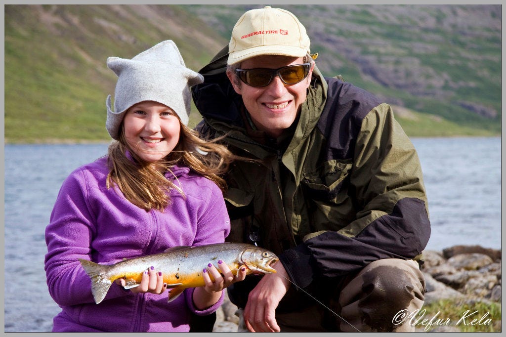 Við heimsóttum gamlar heimaslóðir mínar á Tálknafirði í byrjun ágúst og að sjálfsögðu notuðum við tækifærið og prófuðum að veiða eitthvað í ferðinni. Þessa vikuna var veðrið með eindæmum gott. Inn af Vatnsfirði á Barðaströndinni er Vatnsdalsvatn. Þetta vatn er frekar mikið vatn og geymir stóra fiska. Algengast er þó að veiða 1. – 3. punda fiska.Við ókum inn með vatninu vestan megin alveg inn að ánni sem rennur niður Vatnsdalinn og í vatnið. Við vorum nú ekki lengi að reyna veiðina enda með unga veiðikonu með í för sem er kannski ekkert allt of spennt fyrir þeim rólegheitum sem okkur var boðið upp á. Náðum þó einni bleikju af smæstu gerð.